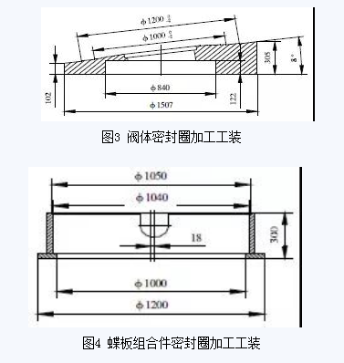 從三偏心金屬硬密封蝶閥的結(jié)構(gòu)特點(diǎn)分析,蝶板組合件密封圈為不銹鋼板與石棉板的組合件,閥體密封圈為硬質(zhì)合金,硬度很高,進(jìn)刀量很難控制,不易一次加工成型,而且加工面的粗糙度要求很高。為保證加工要求,工藝過程為閥體或蝶板組合件粗加工—閥體密封圈堆焊硬質(zhì)合金—保溫12h—熱處理消除熱應(yīng)力—上工裝粗車密封面—上工裝精車密封面—上磨頭磨削密封面—閥體與蝶板組合件合鏜軸孔—強(qiáng)度試驗(yàn)—密封試驗(yàn)。