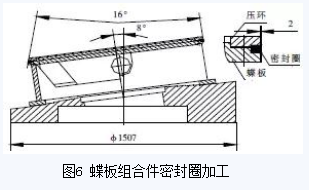 蝶板組合件起密封作用的零件是密封圈,密封圈為斜錐結(jié)構(gòu),其錐頂角為16°,厚度為13.5mm,由5層石棉板及4層不銹鋼板復(fù)合而成(圖6)。密封圈必須與蝶板和壓環(huán)等組裝在一起,加工時(shí)才能防止密封圈夾層中的不銹鋼板及石棉板翹曲變形。根據(jù)其結(jié)構(gòu)特點(diǎn),對(duì)蝶板組合件密封圈采用以下加工方法:(1)先在2.5m立車上分別把蝶板和壓環(huán)上的各止口加工到圖紙要求尺寸,外圓不加工;(2)按圖紙要求對(duì)壓環(huán)鉆孔,蝶板鉆孔攻絲;(3)壓環(huán)、密封圈和蝶板按圖紙裝配,將蝶板組合件工裝用螺栓緊固在閥體工裝上,然后再將蝶板組合件裝夾其上。立車刀桿旋轉(zhuǎn)8°車壓環(huán)、密封圈和蝶板至磨削尺寸;⑷用同樣厚度鋼板替下密封圈,車壓環(huán)、蝶板各錐面至圖紙尺寸;(5)工裝不動(dòng),將壓環(huán)、密封圈、蝶板重新按要求組裝,然后在立車刀架上裝磨頭,對(duì)密封圈進(jìn)行磨削處理,使其達(dá)到圖紙?jiān)O(shè)計(jì)粗糙度要求。
